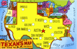 Texans by inbreeding are generally the most garrish, arrogant, and overbearing folk you never want to run into again. They are Loud, boastful, overly proud, bigheaded, bigmouthed, did I say arrogant, pigheaded, and conceited. They crave attention and go to any and all lengths to be the center of attention – you’ll know when a Texan arrives (loud auto horn-playing “The Eyes of Texas…”, Longhorn rack on top of grill). If a guy he’s the one in the 20-gallon cowboy hat, cowboy duds, a belt buckle the size of the halfcourt logo, and Ostrich boots – all in burnt Orange; and contrary to what he says – a whole bunch – the largest organ on him is his mouth. If a woman – she’s in bright red lipstick, platinum blonde hair, tight clothing over her engineered 44DD’s, with cowgirl boots – her “degree” from UT, was in “Husbandry”.