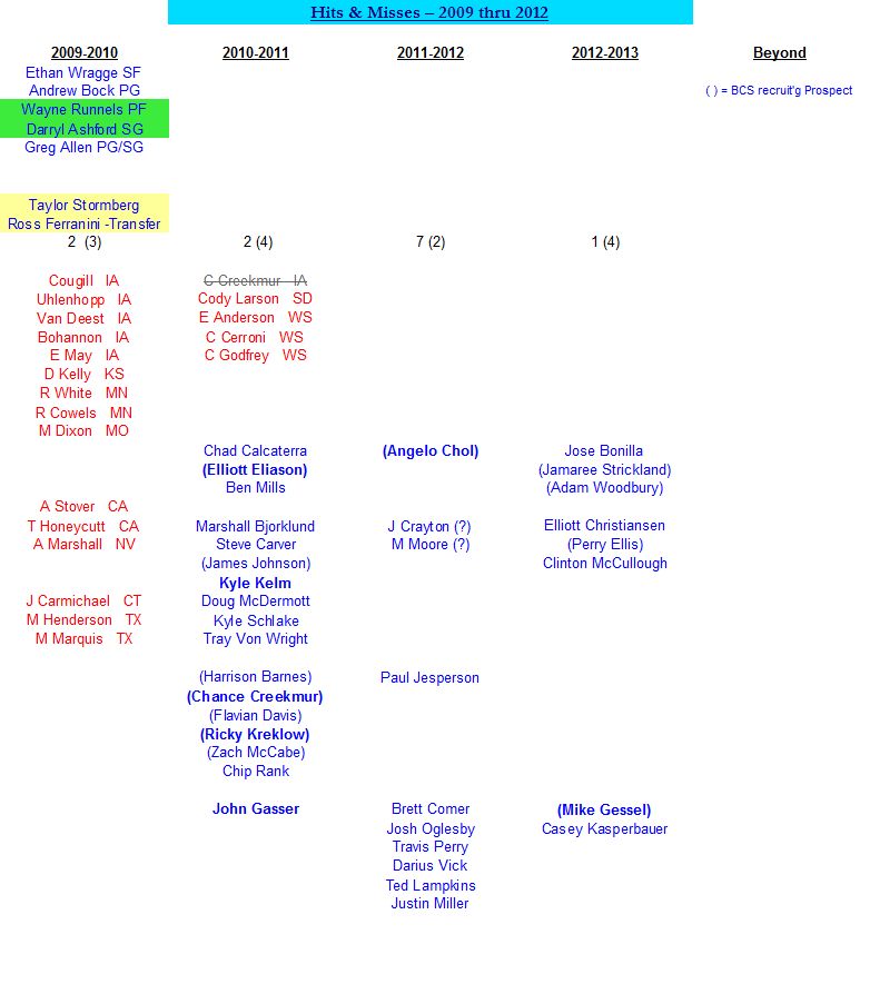 http://bluejaybasketball.wordpress.com/jay-recruiting/I have updated my Hit/Miss table using CJ’s Recruit listings, which are much more palatable, (and in BJC-speak) more ‘realistic’ than the recruit listing I use (a more national & WC flavour). Kids we have offered are in Bold, others in regular type. Parentheses ( ) indicate BCS interest. I have intentionally left the 2010 guards off this table, with exception to the one who has been offered – as the premise here is to focus on the 2010 PF and Ctr positions. Barnes is added for 2010 – because he is a local and in our target area. All CJ recruits are listed for 2011 onward. I added Strickland and Ellis in 2012 as they are in our traditional target areas. I have guessed that the coaching staff will attempt to spread/use 2011 scholies creatively in 2010 and will hold a few for use in 2012.