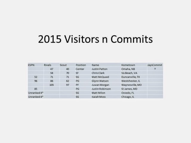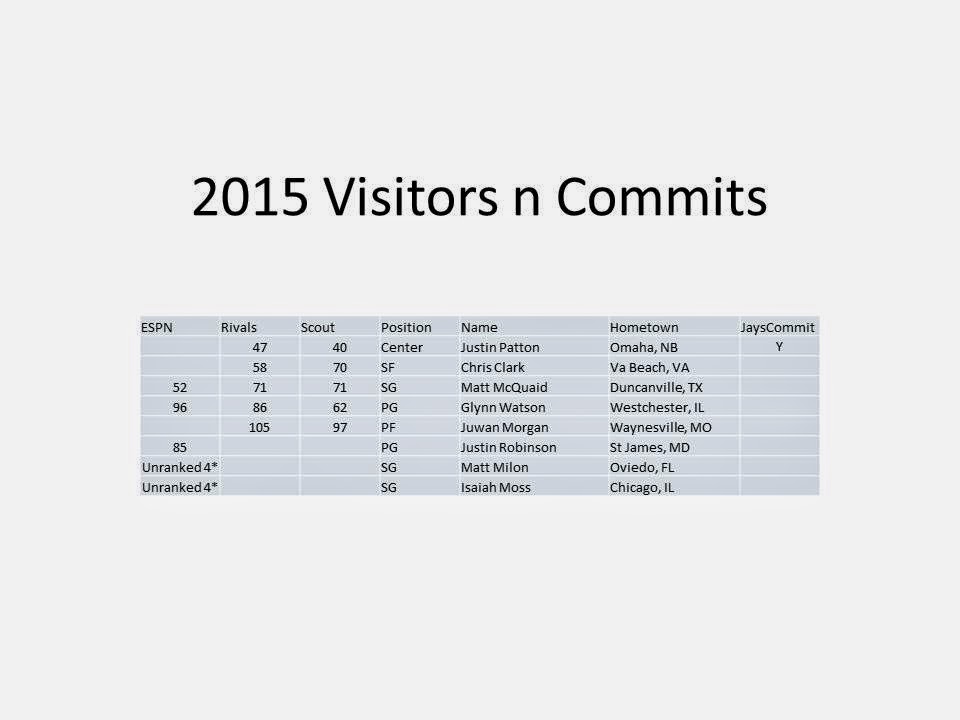 Interesting developments have occurred and seemingly new twists arrive daily. We had one cancelled visit thus far, with the appearance of a possible 2nd cancellation on the immediate horizon. PG Glynn Watson verballed to UNL the day following his visit a week ago. Now it appears that PF Juwan Morgan may also cancel his visit (19 Sep 14), but no confirmation yet.