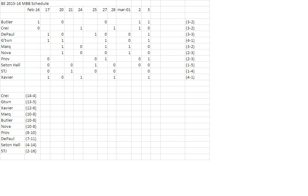 Creighton falls into the .500 ball trap, going 3-2 down the stretch of 16 February thru 5 March 2016. Both Georgetown and Xavier come charging down the stretch run, but the Jays have enough cushion to eek out the Big East Regular Season Championship. Jays go 14-4 in the conference slate, losing 4 on the road (at Georgetown, Marquette, Butler, and Xavier).