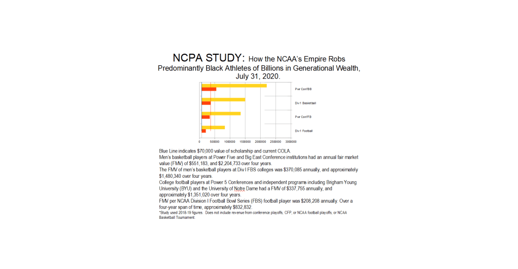 The 2020 NCPA study shows fair market value for Div 1 mens football and basketball athletes ranged from $208K to $551K annually. So NIL is less than a drop in the bucket for the vast majority of players.