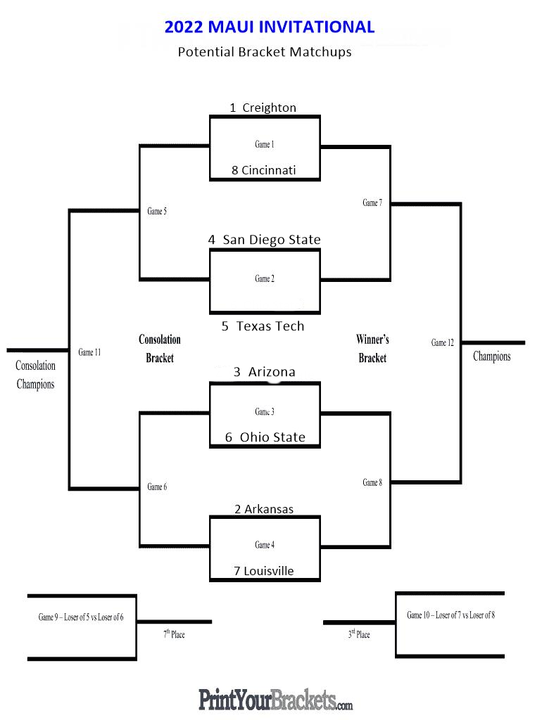 I put out a mock Maui bracket on the BJU…for discussion purposes. Here it is. I used the latest ESPN rankings to seed it. Something to play with and use for discussion. In all likelihood the actual bracket will be different, depending on which poll the good folks in Maui use for their seeding. Jays may end up as the 2-seed with the Razorbacks as the #1.
