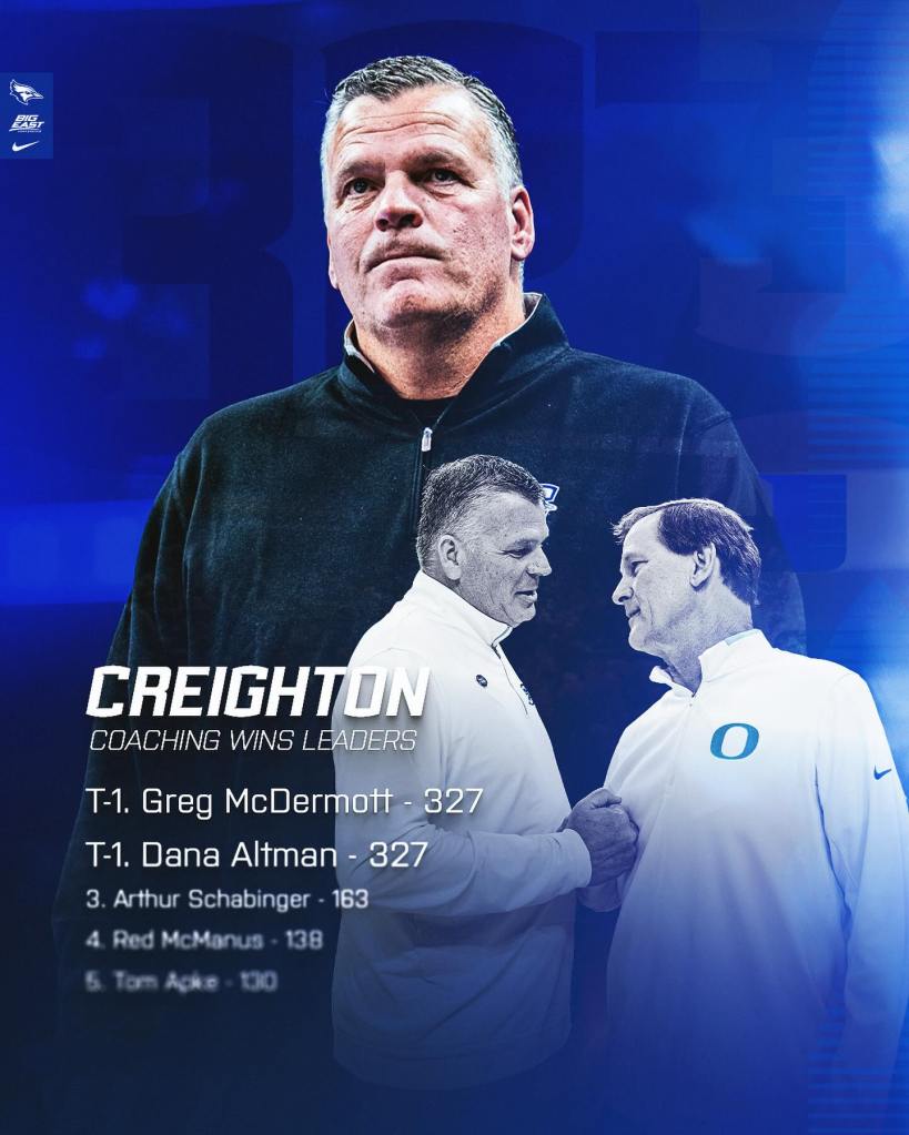 With the W over Houston Christian last night (Nov 13th), CU’s Coach Greg McDermott becomes the all-time leader in wins on the Hilltop. Coach passed Coach Dana Altman last night with his 328th win as the Creighton Bluejays HC.